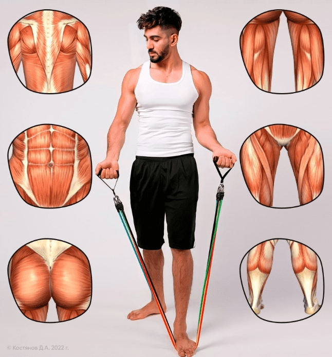 Эспандер позволяет проработать все мышцы тела, но особенно мышцы ног, рук, плеч, груди, спины, ягодиц. Трубчатый эспандер, обеспечивает равномерную нагрузку по всей траектории растяжения и благодаря большой длине создаёт большую амплитуду движения, что увеличивает уровень нагрузки.
