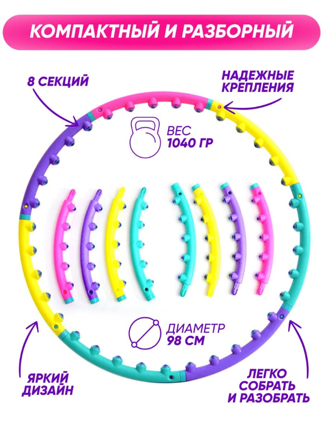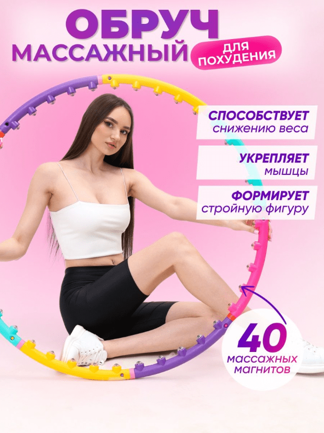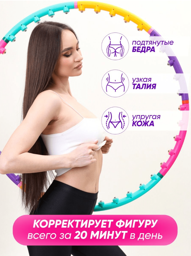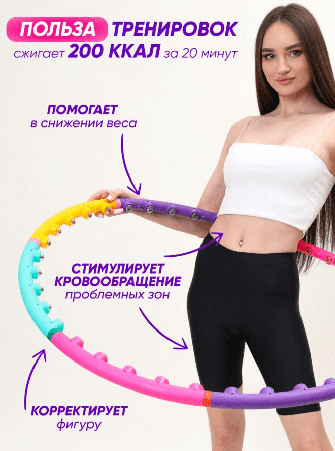 20 минут занятий с обручем сжигает 200 калорий, что равно получасовой пробежке или плаванью. Массажный хулахуп оснащен специальными магнитами, поэтому оказывает не только механическое воздействие на проблемные участки, но и активизирует обмен веществ, снижает количество холестерина, обеспечивает профилактику тромбообразования.